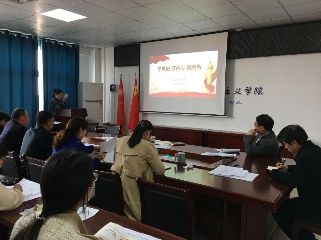 4月14日,马克思主义学院举行党员和教职工政治理论学习会暨“学史立德·树人力行---新进思政教师讲党课”第一讲,学院党总支书记赵国付主持会议,全体党员和教职工参加。