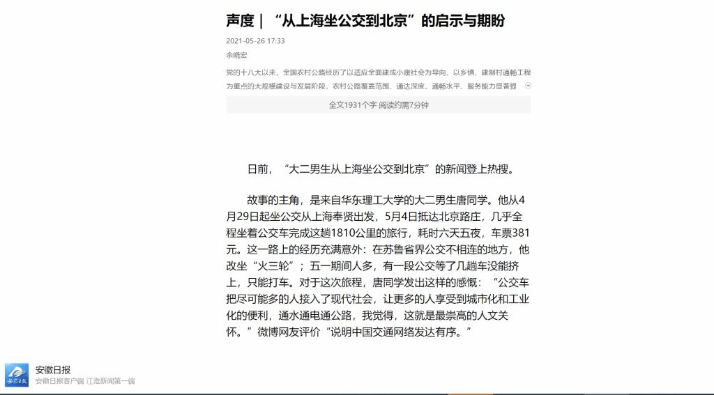 近日,安徽日报思想理论周刊刊发马克思主义学院余晓宏副教授题为“从上海坐公交到北京的启示与期盼”文章。文章以“大二男生从上海坐公交到北京”说明中国公路设施的发展,特别是农村公路建设的成效。文章指出,习近平总书记部署的“四好农村路”是一项民生工程、民心工程、德政工程,便捷的是交通,通达的是财富,连接的是民心,巩固的是党在农村的执政基础;改革发展成果更多更公平地惠及全体人民,不断增强人民群众的交通获得感、幸福感、安全感。