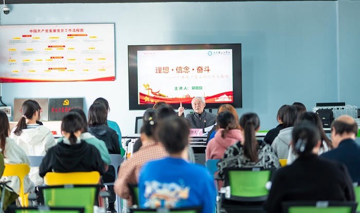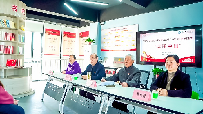 为深入学习贯彻习近平新时代中国特色社会主义思想,全面贯彻落实党的十九届六中全会精神、习近平总书记“七一”重要讲话精神,迎接党的二十大胜利召开,充分发挥“五老”亲历者、见证者、实践者的优势,持续开展以党史学习教育为重点的“四史”教育,引导广大青年学生赓续党的红色血脉、弘扬党的优良传统。马克思主义学院于3月9日下午3:00在学生公寓党建服务站开展“读懂中国”主题党日活动,邀请退休教师党员郭民良做了题为“理想•信念•奋斗——一个老党员的经历与感悟”的专题报告。校党委委员、组织部部长陈啸吟,组织部副部长王淑霞,马克思主义学院党委副书记、纪委书记蒋林梅、马克思主义学院教师代表和青年学生参加了活动,会议由马克思主义学院李玉才教授主持。