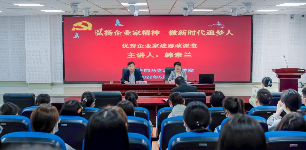 王俊对韩素兰表示衷心感谢和热烈欢迎。王俊指出,劳动模范是千千万万劳动者的突出代表,是中国共产党百年精神谱系具体的承载者。邀请优秀企业家进思政课堂是贯彻落实习近平总书记考察中国人民大学时的重要讲话精神、贯彻落实习近平总书记在庆祝中国共产主义青年团成立100周年大会上的讲话精神的重要内容,为发挥新时代先进人物的榜样示范作用,教育引导广大学生立足新时代新征程,坚定理想信念、强化责任担当、练就过硬本领、坚定爱国奋斗,增强创新创业教育和劳动教育实效具有很好的引领和示范作用。