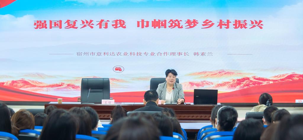 为进一步强化学校、社会协同育人,贯彻落实习近平总书记重要讲话精神,5月13日下午,“弘扬企业家精神做新时代追梦人——优秀企业家进思政课堂”主题报告会在实训C楼103报告厅举办。全国“劳动模范”、安徽省宿州市意利达农业科技专业合作社理事长、宿州市农村合作经济组织联合会会长韩素兰女士作主题报告,思政课教师、部分学生代表参加报告会。报告会由宿州学院纪委书记王俊主持。