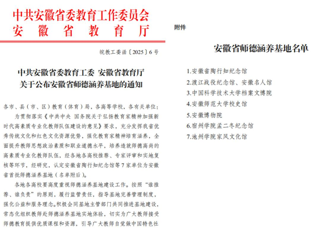 安徽省师德涵养基地是中共安徽省委教育工委、安徽省教育厅为贯彻落实《中共中央国务院关于弘扬教育家精神加强新时代高素质专业化教师队伍建设的意见》要求,充分发挥我省优秀传统文化和红色文化资源优势,强化教育家精神培育涵养,全面培养造就师德高尚的高素质专业教师队伍的重要平台。