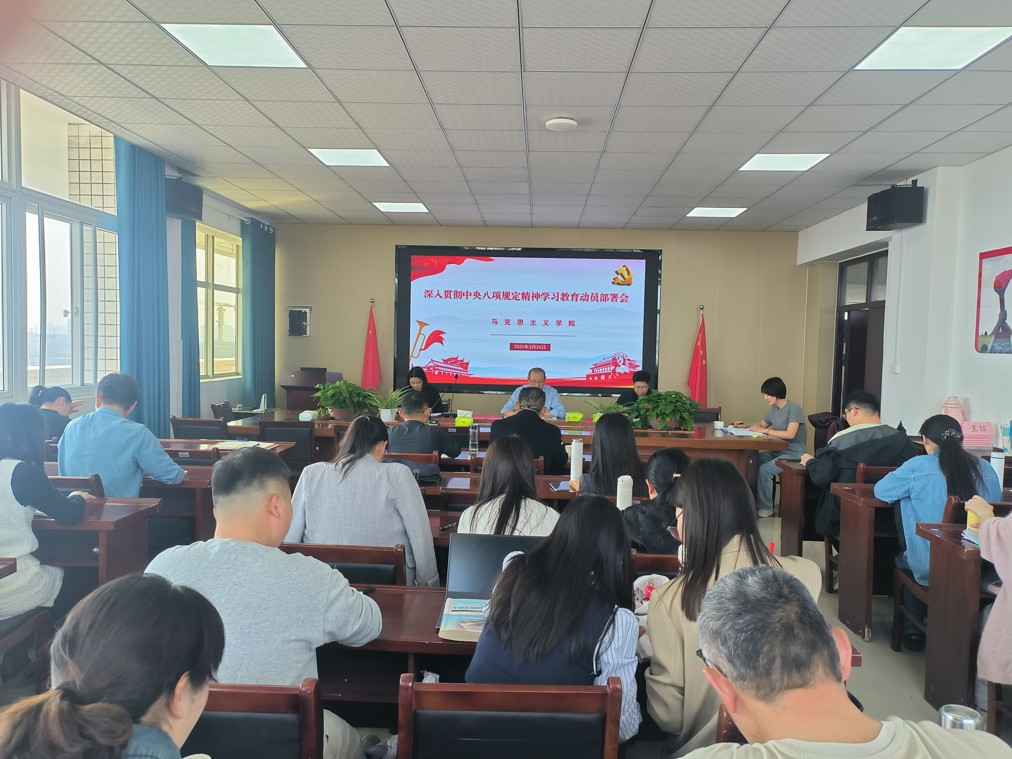 余晓宏解读了校党委《关于在全校开展深入贯彻中央八项规定精神学习教育的实施方案》。会议指出,学院将通过政治理论学习、廉政党课、自查自纠、党风建设等环节,深入贯彻中央八项规定精神学习教育,推动作风建设常态化;会议通报了违反中央八项规定精神典型案例,开展警示教育,以案为鉴、筑牢防线;会议决定,开展自查自纠、“我为师生办实事”等活动,推动全面从严治党向基层延伸,为学院高质量发展提供坚实纪律保障。