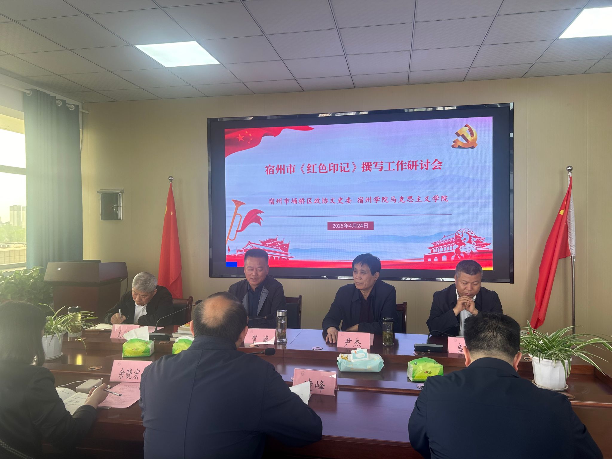 4月24日,马克思主义学院组织召开宿州市《红色印记》撰写工作研讨会,旨在促进宿州市红色文化的传承与创新,推动相关工作迈上新台阶。埇桥区政协文史委主任贺暾及文史资料研究员尹杰、武正彪、盛怀峰等出席会议;马克思主义学院处科级干部、课程组负责人及部分教师代表出席会议,会议由马克思主义学院党委书记、院长凌峰主持。