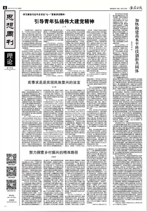 近日,安徽日报思想理论周刊刊发我院马克思主义学院沈玉梅副教授题为“实事求是是实现民族复兴的法宝”文章。文章回顾党的百年历史,指出什么时候坚持实事求是,党就能够形成符合客观实际、体现发展规律、顺应人民意愿的正确路线方针政策,实现中华民族伟大复兴的事业就能够不断取得胜利;反之,离开了实事求是,这一事业就会受到损失甚至严重挫折。