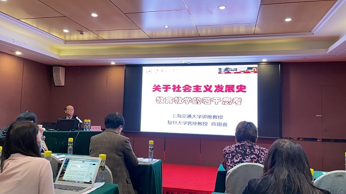 在研讨会上,上海交通大学马克思主义学院陈锡喜教授作了《关于社会主义发展史教育教学的若干思考》专题报告,分析讲解了社会主义发展史课程的教学目标;按照三大阶段、六个时期梳理了教学要点,具体包括空想社会主义的历史地位,科学社会主义的创立、发展和完善,科学社会主义发展的新境遇,俄国十月革命和科学社会主义的发展,苏联社会主义建设和苏联模式,中国特色社会主义的开创和发展,新时代中国特色社会主义新篇章等。国防大学政治学院孙力教授作了《社会主义改革百年进程》专题报告,以社会主义改革为主线,回顾了从列宁开始的前苏联的社会主义改革的历史;分析了苏联模式的特点、弊端,以及社会主义国家进行改革的必然性;揭示了中国的改革对当代社会主义运动的重大贡献。