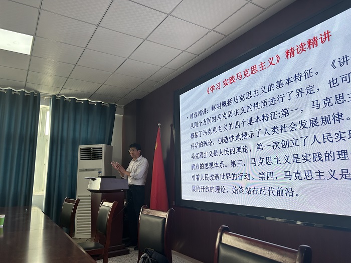 会上,黄凯领读了《习近平著作选读》第二卷中的《学习和实践马克思主义》。本篇著作是习近平同志在纪念马克思诞辰二百周年大会上讲话的一部分。黄凯不仅精讲了节选中明确列举的当前我们应该重点学习和实践的马克思主义九大思想观点:关于人类社会发展规律的思想、关于坚守人民立场的思想、关于生产力和生产关系的思想、关于人民民主的思想、关于文化建设、社会建设、人与自然关系、世界历史、马克思主义政党建设的思想,还对此次讲话的历史背景、未节选的内容和讲话后党和国家发生的变化作了系统论述。他强调,要立足于马克思主义的核心内容、立足于当代中国社会主义建设的主要领导和任务、立足于习近平新时代中国特色社会主义思想的原创性贡献来精读精讲。无论过去、现在还是将来,对马克思主义理论的学习,永远在路上,作为教育工作者、理论宣传者,我们要多读多练,学深悟透。
