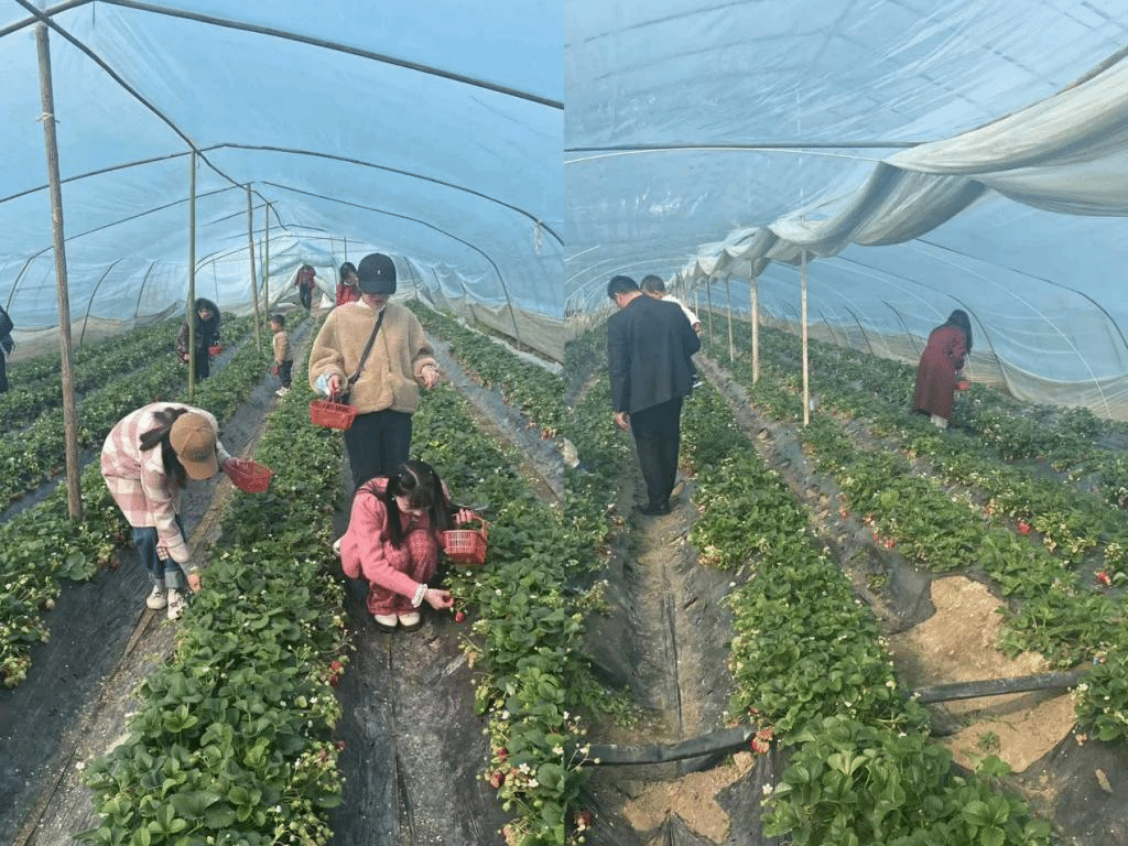大棚里一片生机勃勃,翠绿的叶子、鲜红欲滴的果实、芬芳的果香,让人的心情格外舒畅,大家都露出喜悦的笑容,一边摘着草莓一边互相交流,动手的快乐、品尝的喜悦、打趣的笑声溢满大棚。